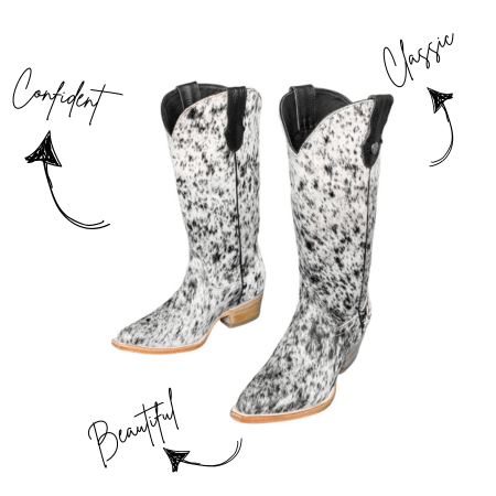 Handcrafted above-calf in premium hair-on-hide cowhide with snip-toe, 32 cm shaft, 5 cm (2 in) stacked heel, elastic gussets & bovine leather lining for comfort and style.